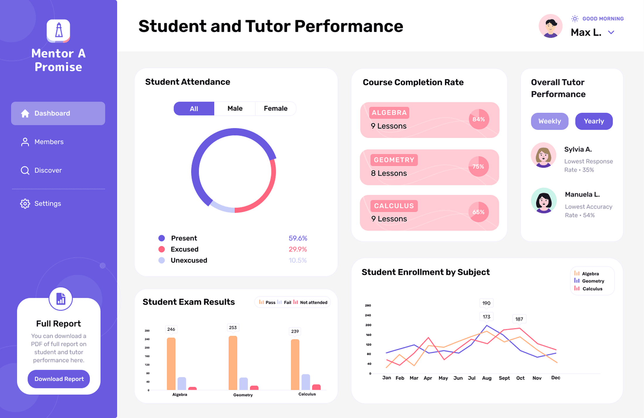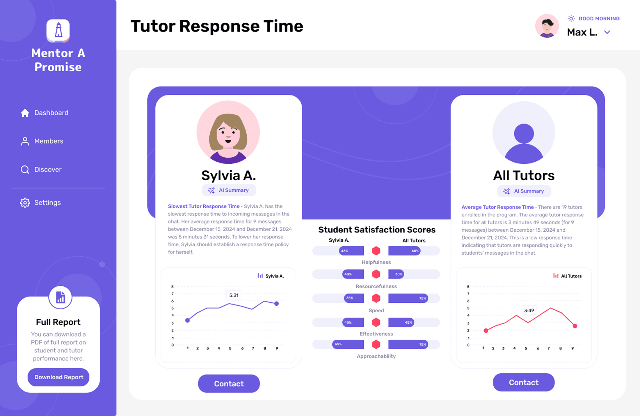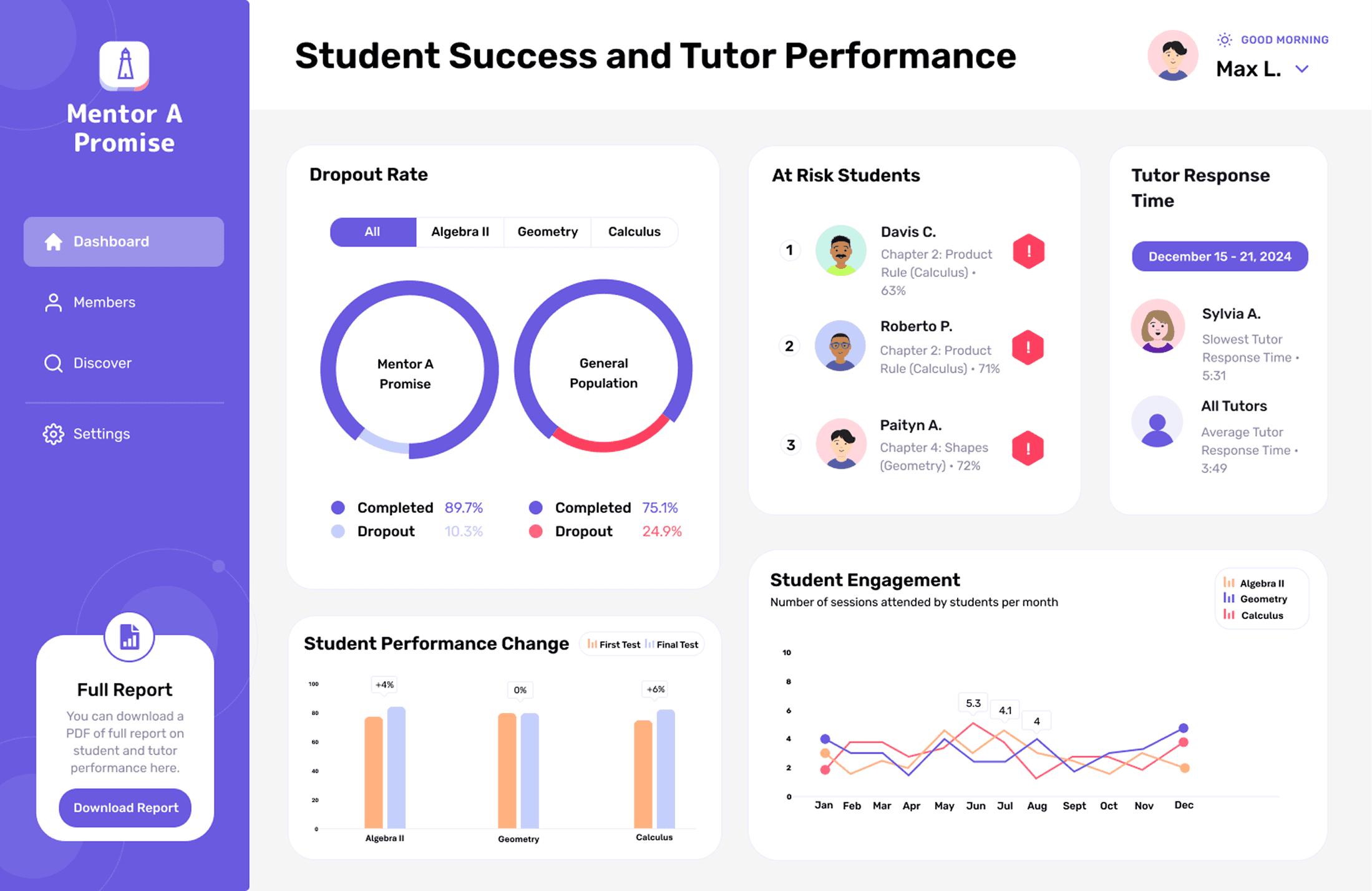 In the final scenario, I wanted to provide more oversight to the program manager to be able to review student and tutor performance in a dashboard. Student and tutor performance metrics are stored in SQL and hard to access for the organization. The solution was to effectually highlight them on a dashboard in order for Max to take swift action. By reviewing the: