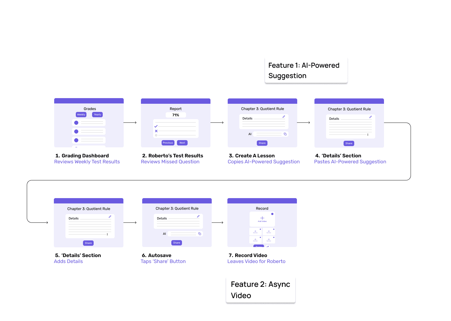 Next, I looked at the tutoring experience. I pitched AI-powered suggestions to offer tutors topic-specific ideas to copy and paste into the ‘Details’ section in the lesson. The tutor’s user experience focuses on early intervention to ensure the student achieves learning outcomes.